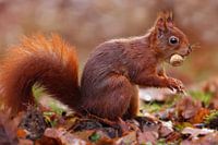 Close-up of a little red squirrel standing with a peanut in autum setting ready to run off.