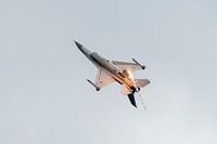 F-16 Fighting Falcon van de Deense Luchtmacht vliegt onderste boven en gebruikt flares en chaff tijdens een vliegshow.