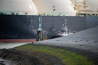 Vertrekkende LNG tanker Marvel Pelican in de Eemshaven. Dit is de eerste keer dat een schip van het type Moss Rosenberg, kenmerkend door de grote bollen aan dek, de Eemshaven aan doet. Na het lossen werd de tanker naar buiten geassisteerd door de sleepboten Waterstroom, Waterstraat, Waterlines van Wagenborg Delfzijl en de Peter Wessels uit Emden.