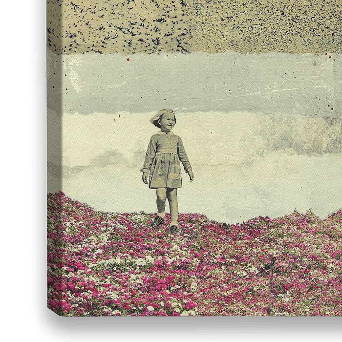 Een meisje speelt buiten in een bloemenveld, met op de achtergrond een akkerbouw landschap. Op een warme zomerse dag, met een onweer storm op komst. Een beeld uit het verleden wat meteen de sfeer en warmte oproept uit de jaren '50.