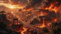 De zon zakt achter de bergen weg, maar geen licht kan de ondergang van deze stad redden. Tempels storten in, paleizen worden door vuur verzwolgen, en rivieren van gloeiende lava vreten zich door de straten van de oude metropool. Daarboven hangt een hemel van rook, vlammen en as – een visioen van de laatste dag.