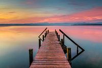 steiger bij zonsopgang, Starnberg, Beieren, Duitsland, gekleurde lucht, blauw, geel, roze, oranje, weerspiegeling, rivier, meer, water, houten steiger, landschap, natuur, prachtig, toeristische bestemming, reis, reizen, reisbestemming, vakantie, vakantie bestemming, fel gekleurde lucht