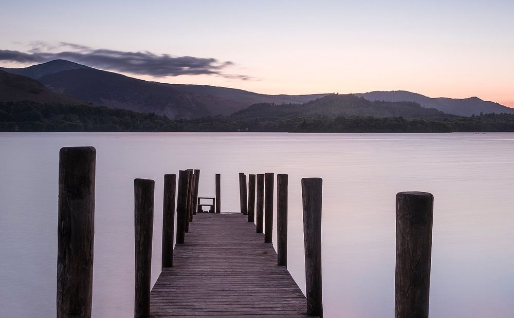 Steiger, veerboot steiger, water, meer, rivier, zonsondergang, paars, blauw, roze, lucht, wolk, wolken, gekleurde lucht, Derwent water, Engeland, kust, landschap, uitzicht, vakantiebestemming, bestemming, vakantie, reis, reizen, toeristisch, toerisme, berg, bergen, natuur, Ashness Bridge in Borrowdale, Europa, geen mensen, brug, hout, rustgevend, ontspannen