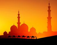 moskee, warme kleur, oranje, geel, zonsondergang, kameel, kamelen, dier, dieren, horizon, Dubai, warmte, kleur, moslim, toren, horizontaal, Islam, reizen, reis, silhouet, woestijn, minaret, architectuur, oosters, bidden, gebedshuis