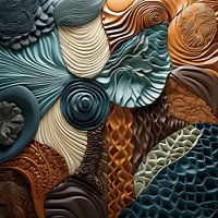Abstracte collage van verschillende kleurrijke texturen in rijke aardetinten met teal en goud accenten.
