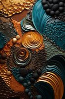 Abstracte collage van verschillende kleurrijke texturen in rijke aardetinten met teal en goud accenten.