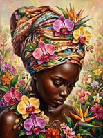Portret van een serene Afrikaanse vrouw versierd met een levendige, kleurrijke hoofddoek en omgeven door exotische bloemen.