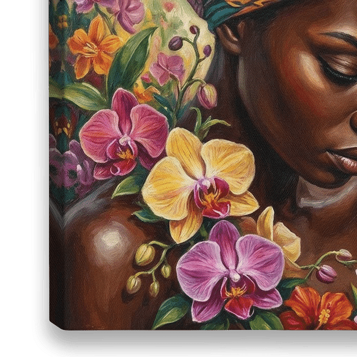 Portret van een serene Afrikaanse vrouw versierd met een levendige, kleurrijke hoofddoek en omgeven door exotische bloemen.
