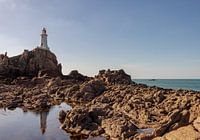 Deze vuurtoren is alleen per voet te bereiken tijdens eb. Mooi pad tussen de rotsblokken door La Corbiere spiegelt in het water van achtergebleven plas tussen de rotsen.