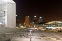 Het lege plein van La Defense zo rond middernacht.