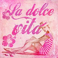 Dame in badpak in vinagestijl met typografie La dolce vita
