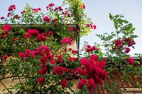 Rode/donkerroze kleuren van bloeiende rozen. Een van de mooiste sferen die een rozenstruik kan geven aan je huis. Gemaakt een Frans pittoresk dorpje in de Vogezen. Geef je huis een "met de Franse slag" gevoel/sfeer met deze zomerse rozenstruik.