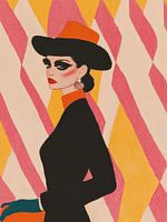 Een elegant en krachtig fashion-portret met een retro-glamoureuze uitstraling. De vrouw, gekleed in een stijlvolle zwarte outfit met een opvallende hoed, straalt zelfverzekerdheid en verfijning uit. Haar scherpe oogmake-up en rode lippen geven haar een dramatische en mysterieuze look. De achtergrond met golvende roze en gele patronen…