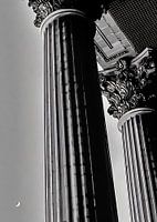 De afbeelding toont twee grote, gecanneleerde zuilen met ingewikkelde Korinthische kapitelen tegen een heldere hemel. De zuilen maken deel uit van een klassieke architectonische structuur, mogelijk een historisch gebouw of monument. Een kleine maansikkel is zichtbaar in de linkerbenedenhoek, wat een serene en tijdloze kwaliteit toevoegt aan de scène.