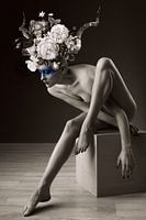 Surrealistisch en krachtig portret van een naakte vrouw. In zwart/wit, met een vleugje sepia en een weinig blauw.