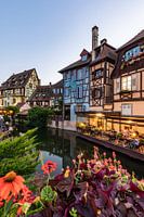 Restaurants aan de oever van de rivier Lauch in de wijk La Petite Venise bij schemering, Krutenau, oude binnenstad, Colmar, Elzas, Frankrijk.