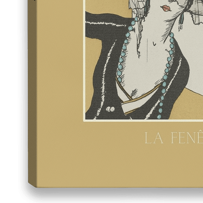Een historische mode prent in een modern jasje: "La fenêtre". Geïnspireerd door de art deco, een stijlbeweging die opkwam in de jaren twintig van de vorige eeuw. Nieuw zakelijkheid gemengd met moderne strakke lijnen en kleuren.