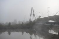 Nancy France La passerelle de la Méchelle, dedicated pedestrian and cycle bridge crossing the River Meurthe in the mist of a chilly Sunday autumn morning. fog, weather,