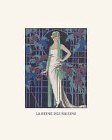 Een historische mode prent in een modern jasje: "Le reine des raisin". Geïnspireerd door de Art Deco, een stijlbeweging die opkwam in de jaren twintig van de vorige eeuw. Nieuw zakelijkheid gemengd met moderne strakke lijnen en kleuren.