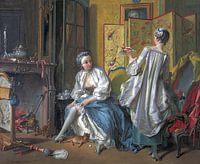 Het aankleden en opmaken met make-up van een dame het toilette of het toilet. Hier bevinden twee vrouwen zich in dit precaire moment waarop ze nog niet toonbaar zijn. De ene vrouw trekt een kous aan en laat een stuk been naakt zien op het kunstwerk en een diep decolleté. De andere meid draagt haar japon nog.