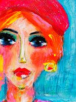 Het intuïtieve portret La vie en rose neemt je mee naar Parijs door de rode baret. Met haar frisse blauwe achtergrond en oranje gele lokken lijkt ze zo uit een kunstzinnige film te zijn gewandeld. En dan zie je het: dit is geen standaard portret, dit is een intuïtief portret vol energie en inspiratie. Letterlijk, want iets meer dan de helft van haar gezicht schittert, de rest laat ze aan je fantasie over.