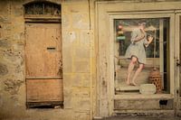 Foto van een Frans straatje met een oude deur en een etalage met een foto van een dansende vrouw met de tekst "la vie est belle". Gemaakt in het middeleeuws dorpje Monflanquin in Frankrijk in het departement Lot-et-Garonne in de regio Nouvelle Aquitaine.