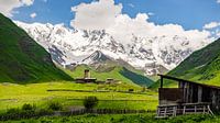 LaMaria kerk (Ushguli, Georgië) met de berg Shkhara op de achtergrond