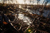 Detail foto in een nat en regenachtig stuk landbouw grond met plassen en stoppels van gewassen. Het laatste ijs van de winter reflecteert het najaar zonlicht