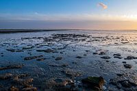 Laag water op het Wad bij Holwerd tijdens zonsondergang aan het einde van een regenachtige Zomerdag in Juli 2023. De laanghangende zon geeft een mooi strijklicht over het slib van de Waddenzee