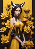 Koop dit Popart kunstwerk Laagpoly gebloemd vossenmeisje, zwart en geel van 1xMerch op canvas, aluminium dibond, (ingelijste) fotoprint, behang en ArtFrame, op maat geprint in Fine-Art kwaliteit.
