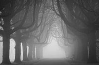 Laan met bomen in de mist. Bijna zwart vervaagd met de meter via alle tinten grijs naar het witte centrum van de foto. Als een tunnel.