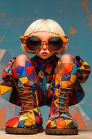 Een opvallend meisje, met kort blond haar, heeft een grote kleurige zonnebril op en haar kleding is fel gekleurd met geografische vormen. Zij heeft grote laarzen aan die ook uit felgekleurde geografische vormen bestaat. Zij zit op haar hurken zodat de laarzen het meest opvallen, een moderne opvallende stijl. Het beeld is met behulp van…