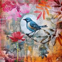 Kleurrijk mixed media kunstwerk met een blauwe vogel in een nazomerse herfstsfeer met bloemen, bladeren, texturen en typografische elementen.