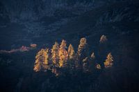 Lariks bomen in het laatste zonlicht op een berg in de Italiaanse Dolomieten.