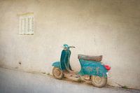 Ee oude blauwe scooter leunt zachtjes tegen de muur, stil en verlaten, alsof hij wacht op een herinnering die nooit terugkeert.