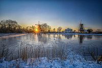 Vlak voor zonsondergang, met de laatste zonnestralen langs de molen, en streep licht over het ijs schijnend.