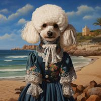 Betreed een tijdloos tafereel met een Labra Doodle gekleed in traditionele Spaanse kleding, genietend van het strand. Dit kunstwerk combineert de vreugde van een Labra Doodle met de sfeer van een traditionele kunstvorm. Een meesterlijke samensmelting van karakter en kunst aan de Spaanse Kusten.