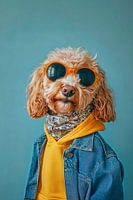 Met zijn krullende, gouden lokken en stijlvolle zonnebril straalt de Labradoodle onvermoeibare charme uit. De nuchtere denim look, gecombineerd met een felgele hoodie, geeft hem een vrolijke, casual uitstraling. Een echt modestatement op vier poten dat uitnodigt om te ontdekken en te blijven hangen!