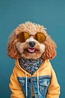Deze Labradoodle is stijlvol en cool met zijn pluizige gouden vacht en stralende glimlach. De zonnebril en casual hoodie geven hem een onnavolgbare charme. Zijn speelse uitstraling en modieuze uiterlijk maken hem tot een absolute blikvanger - een echte trendsetter onder de viervoeters!