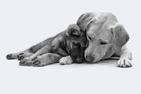 Blonde labrador ligt samen met een herder pup. Ze snuffelen wat.