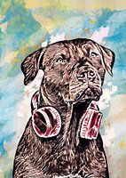 Koop dit abstracte kunstwerk Labrador met hoofdtelefoon aquarel achtergrond van KalliDesignShop als print op canvas, aluminium dibond, (ingelijste) fotoprint, behang en ArtFrame. Voor jou op maat geprint in Fine-Art kwaliteit.