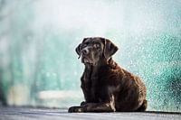 Labrador retriever hond liggend met blauwe textuur achtergrond in de stad