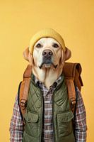 Met zijn warme glimlach en trouwe ogen straalt deze Labrador retriever charme en dorst naar avontuur uit. Gekleed in een stijlvol vest, shirt en opvallende pet is hij klaar voor de volgende ontdekkingsreis. Zijn rugzak geeft aan dat hij altijd klaar is om nieuwe vrienden te maken en plezier te hebben!