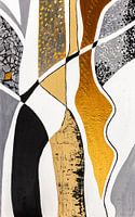 Verschillende structuren, warme kleuren door het oker, zwart en goud. Een schilderij geschilderd met acrylverf op canvas. Helderheid door de witte golvende lijnen. Onderbroken door de zwarte contouren. In dit schilderij zie je veel reliëf en verschillende motieven. Art deco, gaf mij inspiratie.