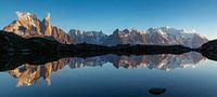 Panorama van het Mont Blanc massief weerspiegeld in Lac de Chésery vlak voor zonsondergang.