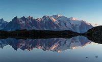 Het laatste zonlicht op het Mont Blanc massief bij Chamonix, weerspiegeld in Lac de Chesery.