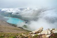 Prachtige landschap opname van de Zwitserse Alpen nabij Grimentz in de Val d'Anniviers vallei in het kanton Wallis in Zwitserland in de zomer met een rots in de de voorgrond en het stuwmeer Lac de Moiry in de achtergrond