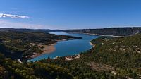 Uitzicht over het meer Lac de Sainte-Croix aan het westelijke einde van de Gorges du Verdon in de Provence, Frankrijk op een zonnige dag in de herfst omgeven door beboste heuvels met de Pont du Galetas brug.