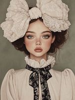 In dit portret draagt een jong meisje een oversized, gedetailleerde kanten strik op haar hoofd, wat haar delicate trekken en zacht gekrulde kastanjebruine haar complementeert. Haar sproeterige wangen en grote, groene ogen geven haar een onschuldige, popachtige uitstraling. De zachte, gedempte tonen van haar kleding, in combinatie met de…