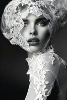 Expressief portret van een vrouw in kant met voile in zwart-wit.